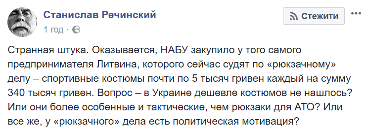 Як інформує Цензор.НЕТ, про це він написав на сторінці у Facebook."Дивна річ. Виявляється, НАБУ закупило в того самого підприємця Литвина, якого зараз судять за "рюкзачною" справою, спортивні костюми майже по 5 тисяч гривень кожен на суму 340 тисяч гривень. Питання - в Україні дешевших костюмів не знайшлося? Або вони більш особливі й тактичні, ніж рюкзаки для АТО? Чи все-таки в "рюкзачної" справи є політична мотивація? " - написав він.