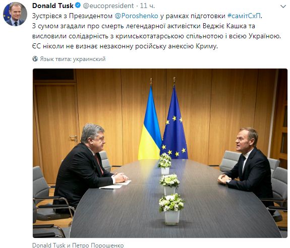 "Зустрівся з Президентом Порошенком у рамках підготовки до саміту Східного партнерства. З сумом згадали про смерть легендарної активістки Веджіє Кашка і висловили солідарність з кримськотатарською спільнотою і всією Україною. ЄС ніколи не визнає незаконну російську анексію Криму", - заявив Туск.