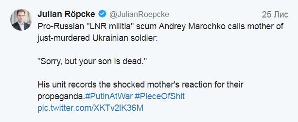 "Проросійський "ополченець ЛНР" негідник Андрій Марочко подзвонив враженій матері щойно вбитого українського солдата:"Извини,но твой сын мертв". Його угруповання записує реакцію шокованої матері для своєї пропаганди", - написав німецький журналіст.