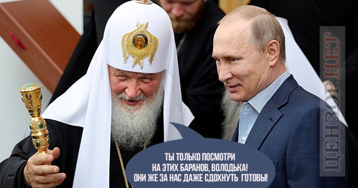 Россию сигарет и спирта «Royal» (наберите в поисковике "табачный митрополит"), живет со своей троюродной сестрой, судится с соседями, фотошопит часы, переделывает заповеди в понятия, благословляет на братоубийственную войну с Украиной.