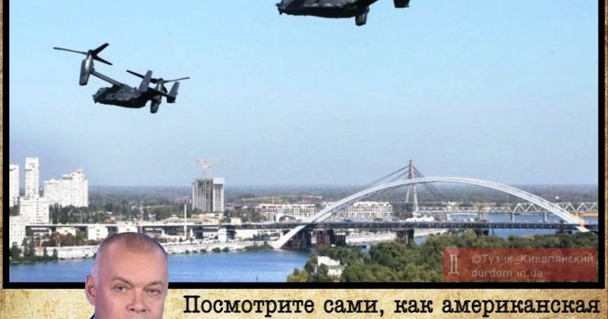 Летять американськібойовіконвертоплани над Києвом, і один другому каже: - Джонні, ти чув, що про нас росіяни кажуть? Що ми тут тренуємось пожежі гасить… - Ну, що тобі сказать … Якимсь чином, у переносному сенсі, вони праві… Наш політ, спільно з Б-52, дійсно не дає розгоріться пожежі…Пожежі війни на Донбасі… А горіння своїх задниць, вмкликаних нашими польотами, хай гасять самі…