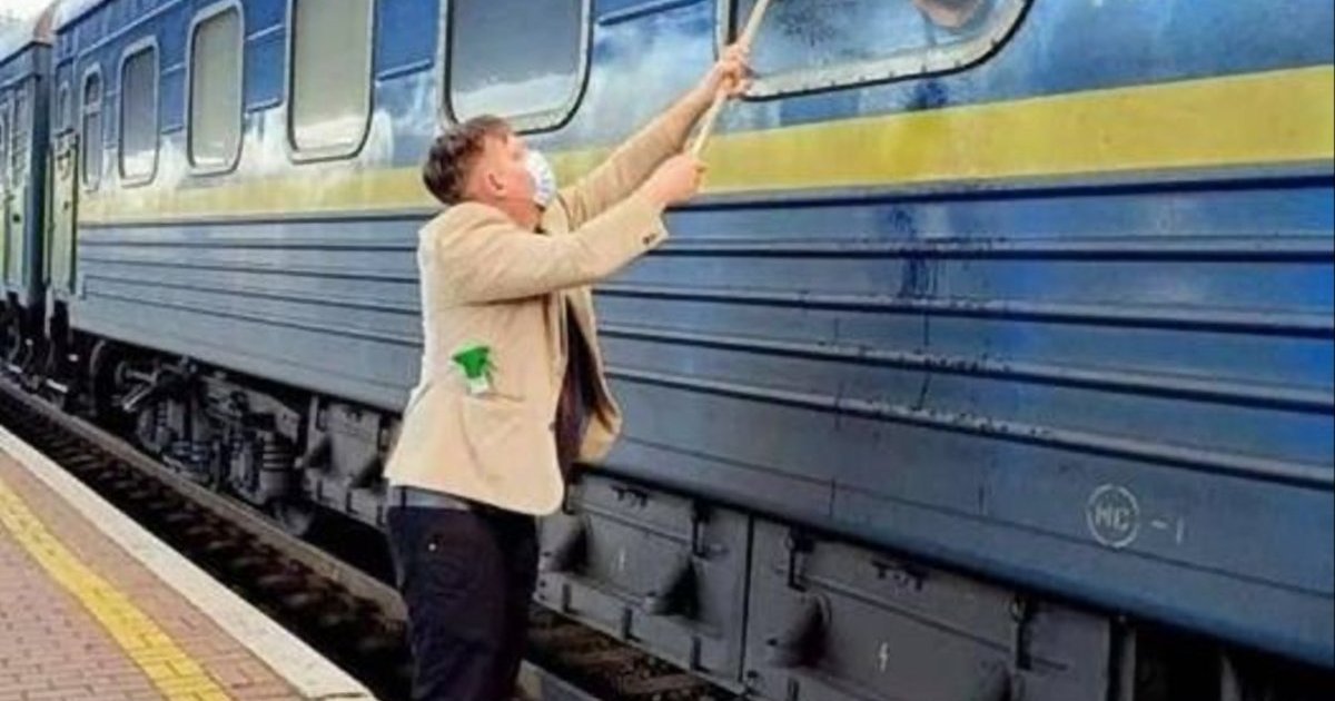 щасливе та радісне обличчя відомого пана у вікні вагона, який є членом наглядової