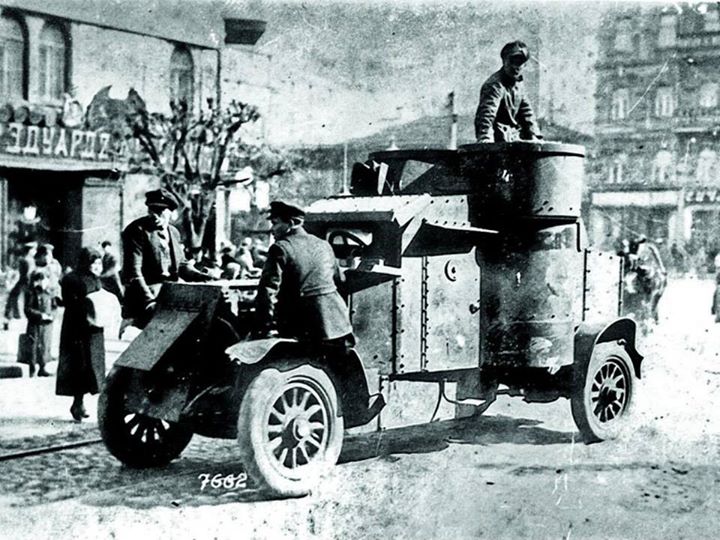 Броньований автомобіль на вулицях українського міста, початок 1918 року.