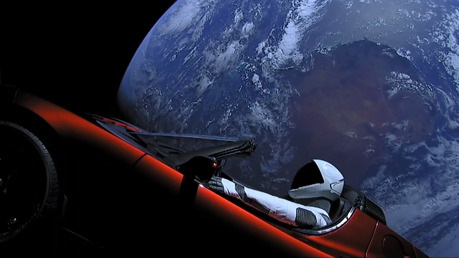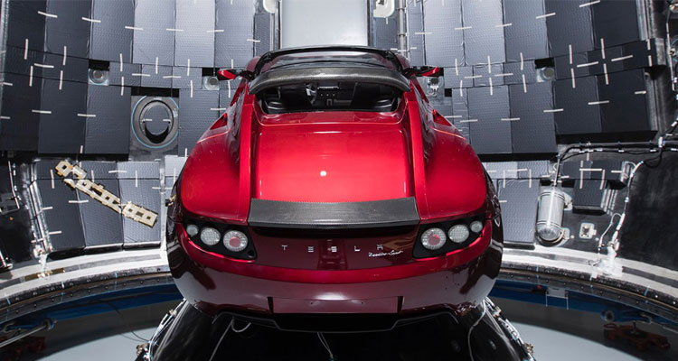 - Ракета Falcon Heavy, чей первый пуск завершился успешно, запустила в космос спорткар Tesla Roadster, в котором играет песня Space Oddity Дэвида Боуи. На момент выхода в космос телеметрия показывала, что машина со скоростью свыше 10000 км/ч направляется к Марсу и скорость растет. Это, на данный момент, безусловно самый быстрый автомобиль в мире. На его бортовом мониторе одна фраза: Dont panic - "Не паникуйте".