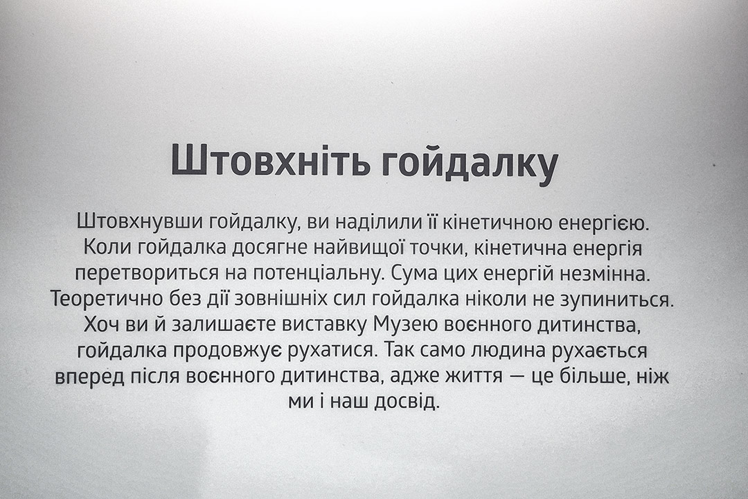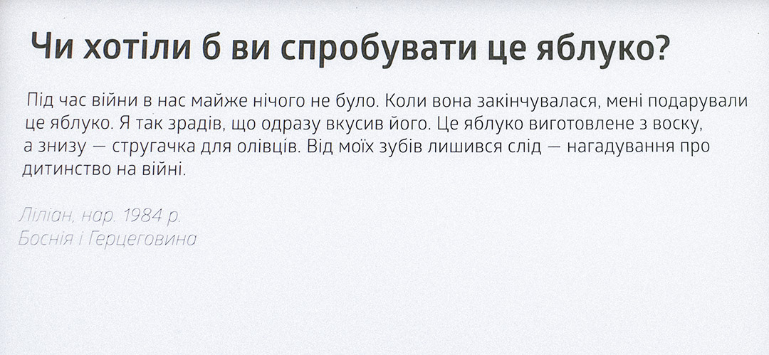 Одяг для ляльки, іграшковий ведмедик, дитячий щоденник, летючий змій, тепла ковдра і ще багато різних предметів, які асоціюються у дітей з періодом війни в їхньому житті, зібрані в одну експозицію. Кожний предмет супроводжує уривок з інтерв’ю з їхніми маленькими власниками.