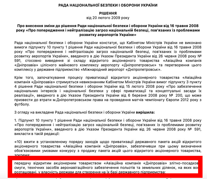 Втім, формально в цьому другому рішенні РНБО від 2009 року все ще була зазначена засторога про те, що після приватизації цілісного майнового комплексу аеропорту "Дніпропетровськ" приватним інвестором він все ж таки повинен був повернути державі злітно-посадкову смугу та аеронавігаційне обладнання.