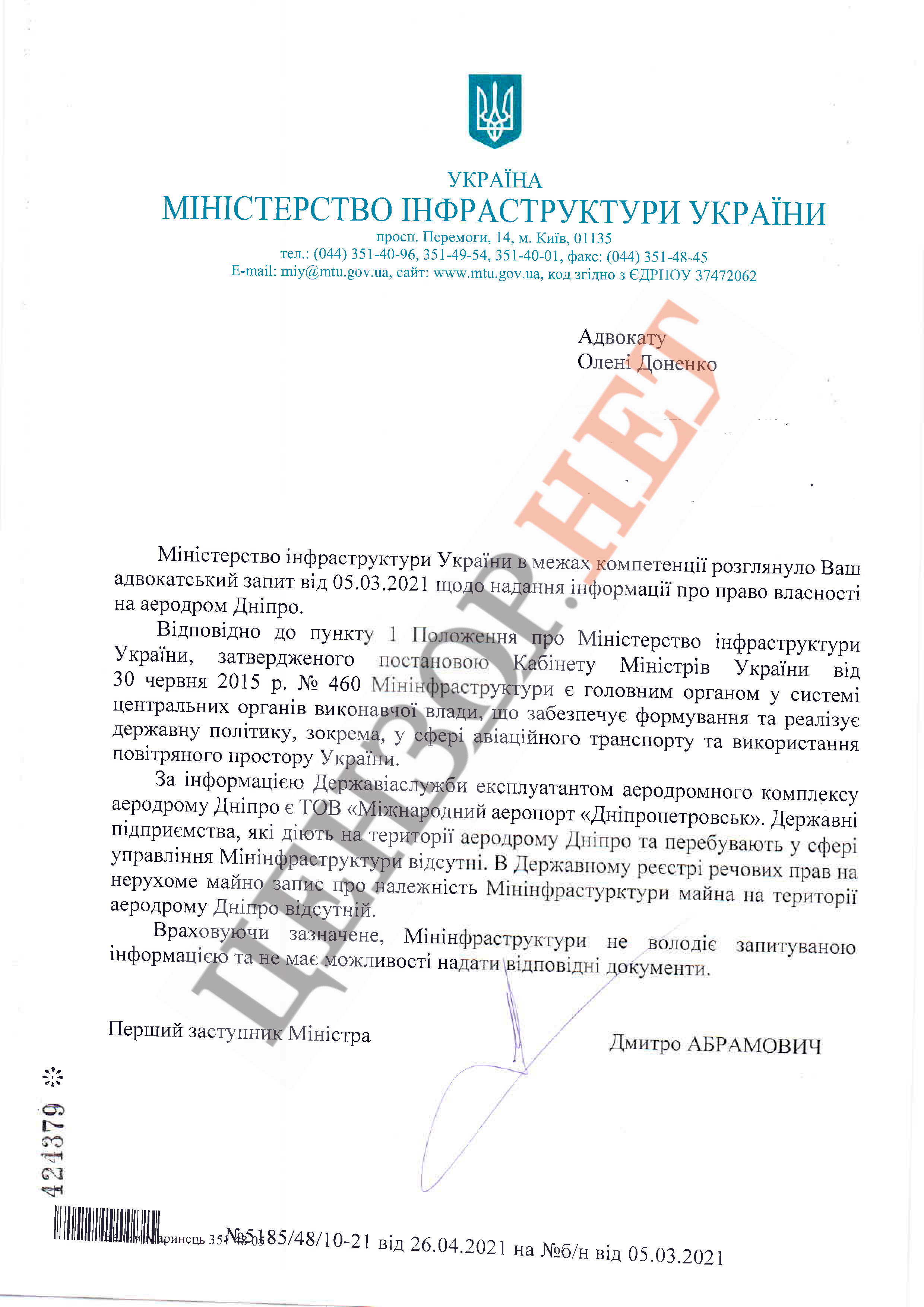 Згідно з офіційними відповідями державних органів на публічні запити, зокрема, від профільного Міністерства інфраструктури України та Міністерства оборони України, - обидва міністерства офіційно зазначили, що не мають жодних прав власності на жодні об’єкти, що розташовані сьогодні на території цілісного майнового комплексу дніпровського аеропорту.
