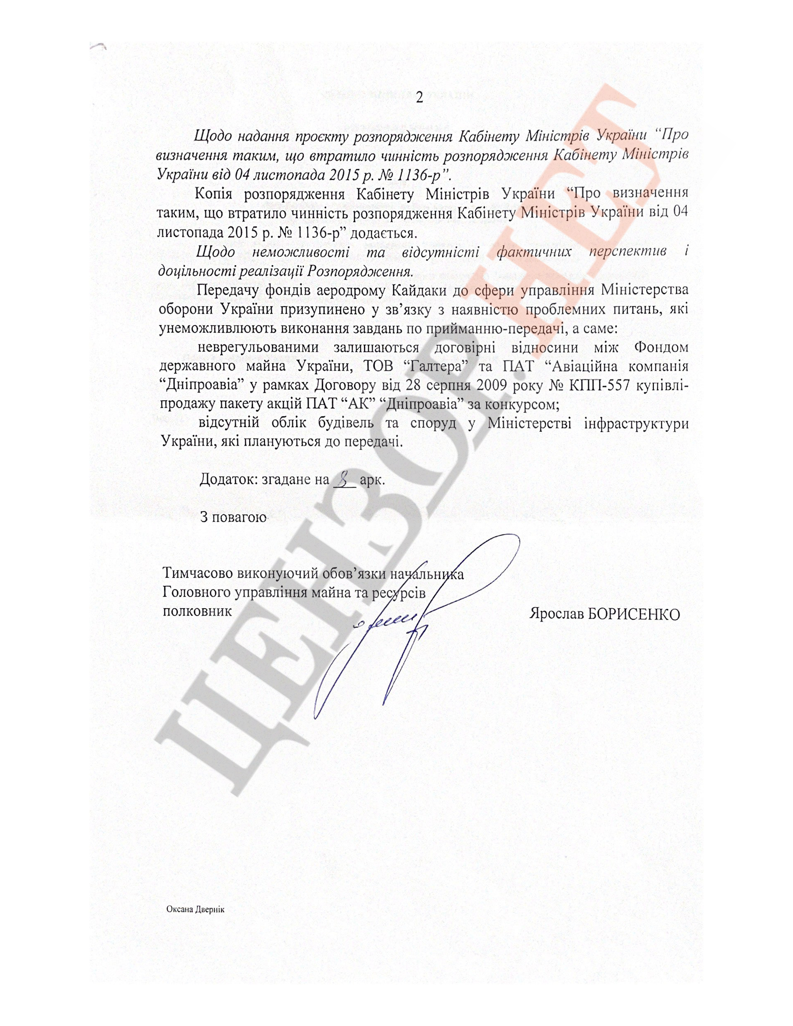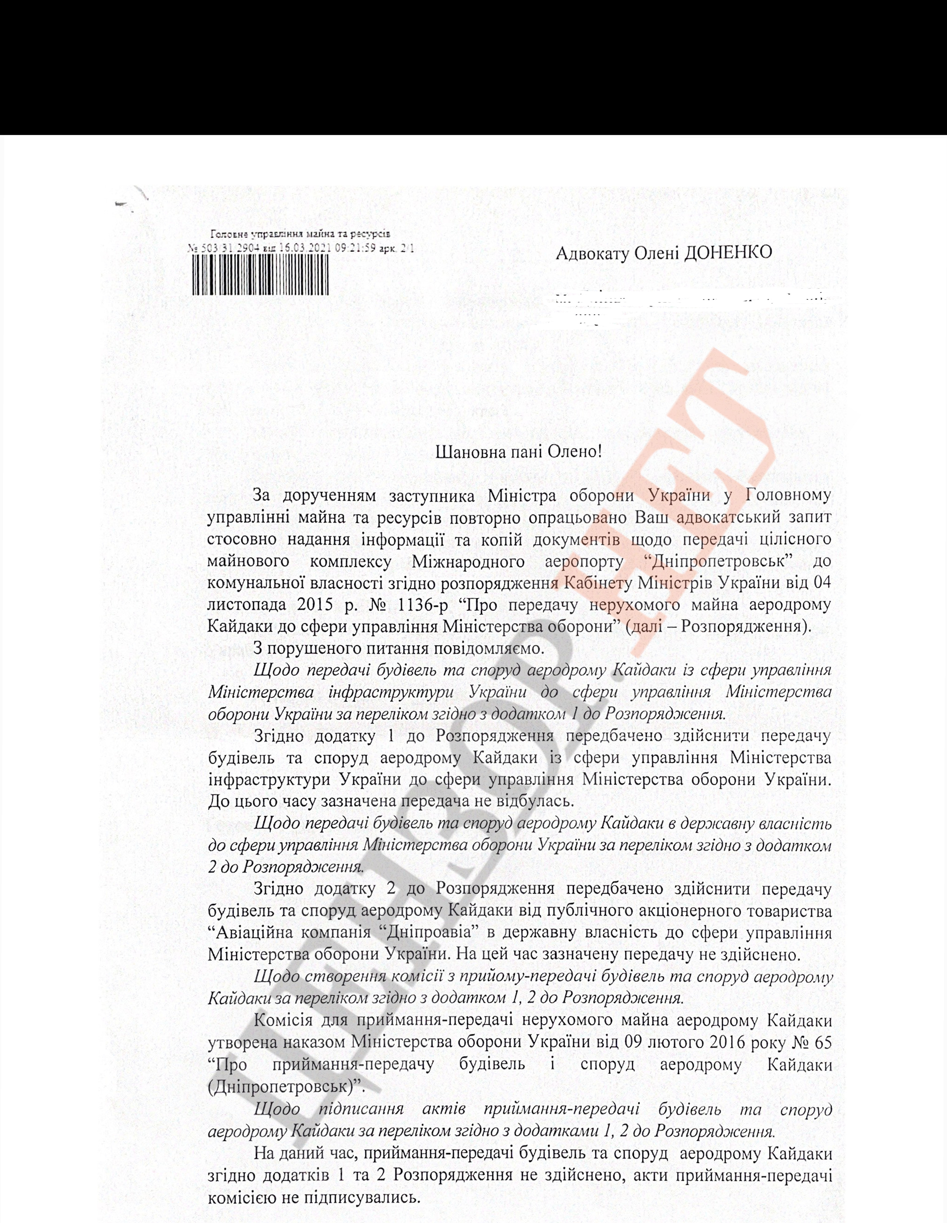 Водночас, як вже зазначалось вище, у розпорядженні Цензор.НЕТ є відповіді на запити адвоката Олени Доненко – представниці міськради Дніпра, з яких випливає, що ні в державну власність на баланс Мінінфраструктури, ні на баланс Міноборони, ні в комунальну власність споруди та майно аеропорту не передавалось.