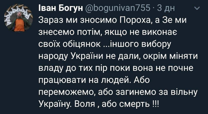 - "Петр Алексеевич Порошенко, - прочитал Зеленский. - Угорь Болерьевич Коламойзге..." Ну, все правильно, вроде, давайте на пятницу уже вводить.