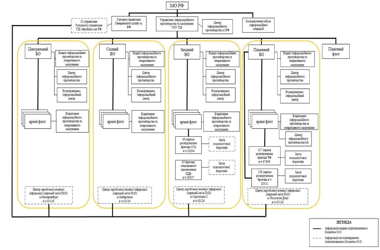 Підполковник Кошель підтвердив і доповнив вже наявні дані щодо системи організації російських військ ІПСО. У структурі Головного управління Генерального штабу ЗС РФ існує 12 управління, що займається проведенням спеціальних заходів в інформаційному просторі через підпорядковані військові частини. Щонайменше існує 4 військові частини в/ч 03138 (н.п. Єкатеринбург), в/ч 03134 (н.п. Хабаровськ), в/ч 03126 (н.п. Сєртолово-2), в/ч 03128 (н.п. Ростов-на-Дону), які, як припускається, проводять спеціальні заходи зі здійснення психологічного впливу. За даними різних джерел інформації зазначається, що закритим найменуванням цих частин є "Центр воєнної зарубіжної інформації та комунікацій" або "окремий загін психологічних операцій". Однак, за інформацією Кошеля О. О., підрозділів із закритим найменуванням "Центр воєнної зарубіжної інформації та комунікацій" взагалі не існує. Також, Кошель О. О. зауважив, що інформація щодо Головного управління ГШ ЗС РФ та підпорядковані військові частини є дуже закритою та військовослужбовці ЗС РФ майже не обговорюють ці теми між собою через страх переслідування з боку правоохоронних органів