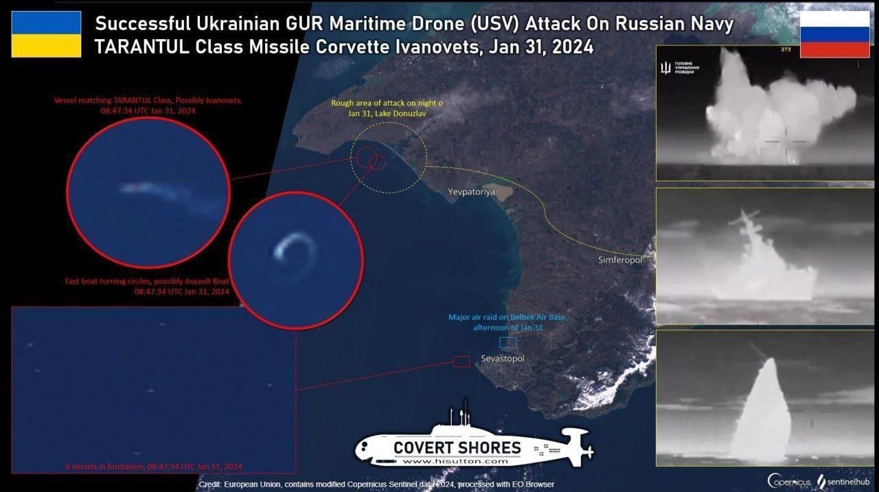 Екіпаж ракетного катера, за даними ГУР це був "Ивановец", судячи з відео, помітив наближення дронів візуально тільки перед самою атакою. Катер у момент атаки був на ходу і міг маневрувати. Ракетний катер може розвинути швидкість понад 30 вузлів і просто втекти від дронів. Але набрати швидкість "Ивановец" не встиг.