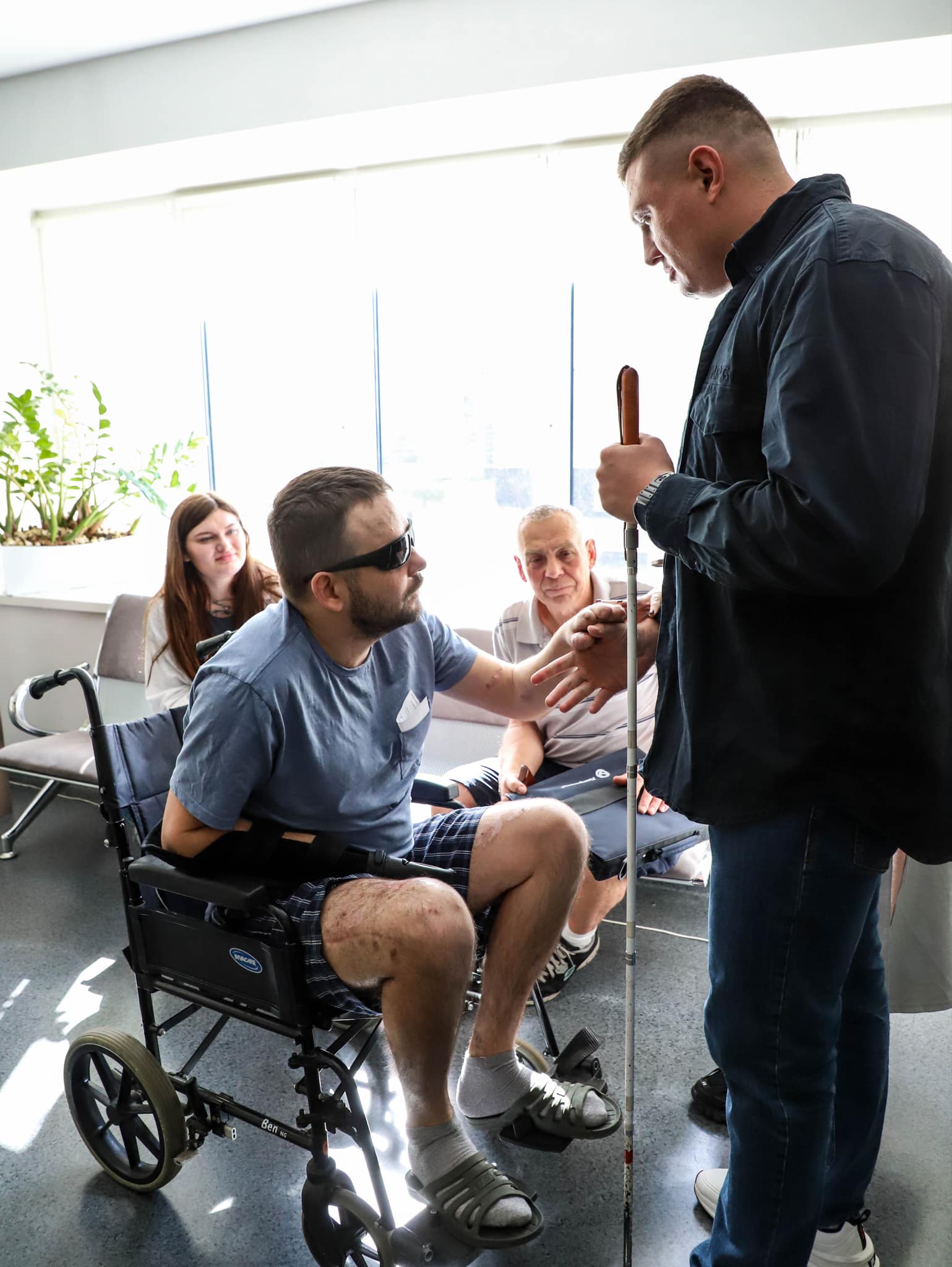 І ще один напрям нашої роботи – реабілітація ветеранів, які повністю втратили зір внаслідок мінно-вибухових травм. У нас є мобільні групи ерготерапевтів, які працюють як госпітальні волонтери. Вони приїжджають до хлопців, яких ми ще не можемо забрати на повний цикл, і працюють з ними на території лікарень в Києві.