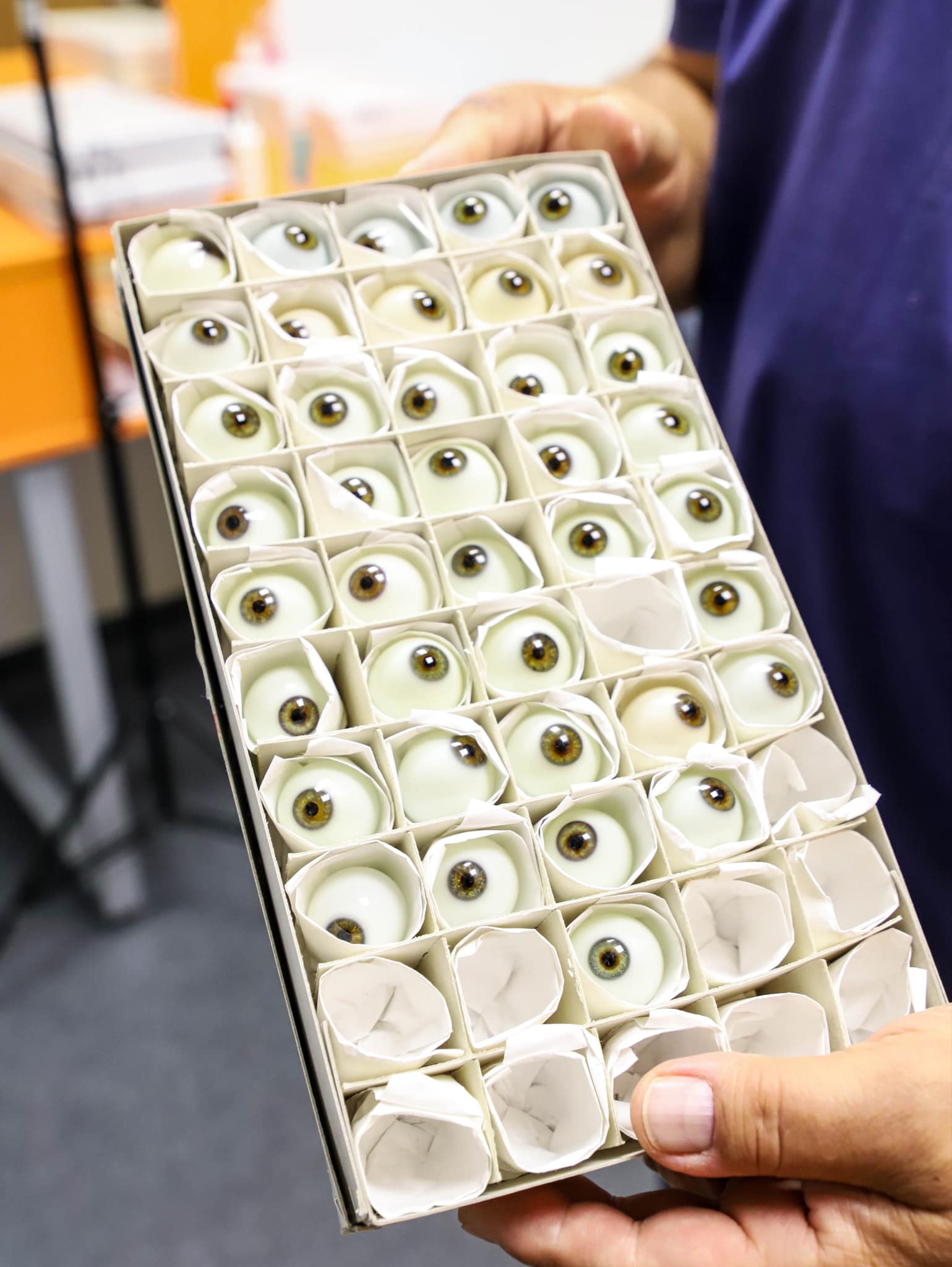 В.В.: Років 20 тому в присутності пацієнта гарячим склом - способом видування – око малювали. І це займало дуже багато часу. Бо треба було виготовити приблизно 10 протезів, щоб хоча б в колір потрапити. Звісно, з часом технології змінились. І зараз ми приїжджаємо з великою колекцією вже готових кольорів. Але все одно в процесі роботи їх треба трохи доповнювати або змінювати. Бо два однакові ока не буває. Але інноваційні технології дозволяють нам протезувати за день до 10 пацієнтів.