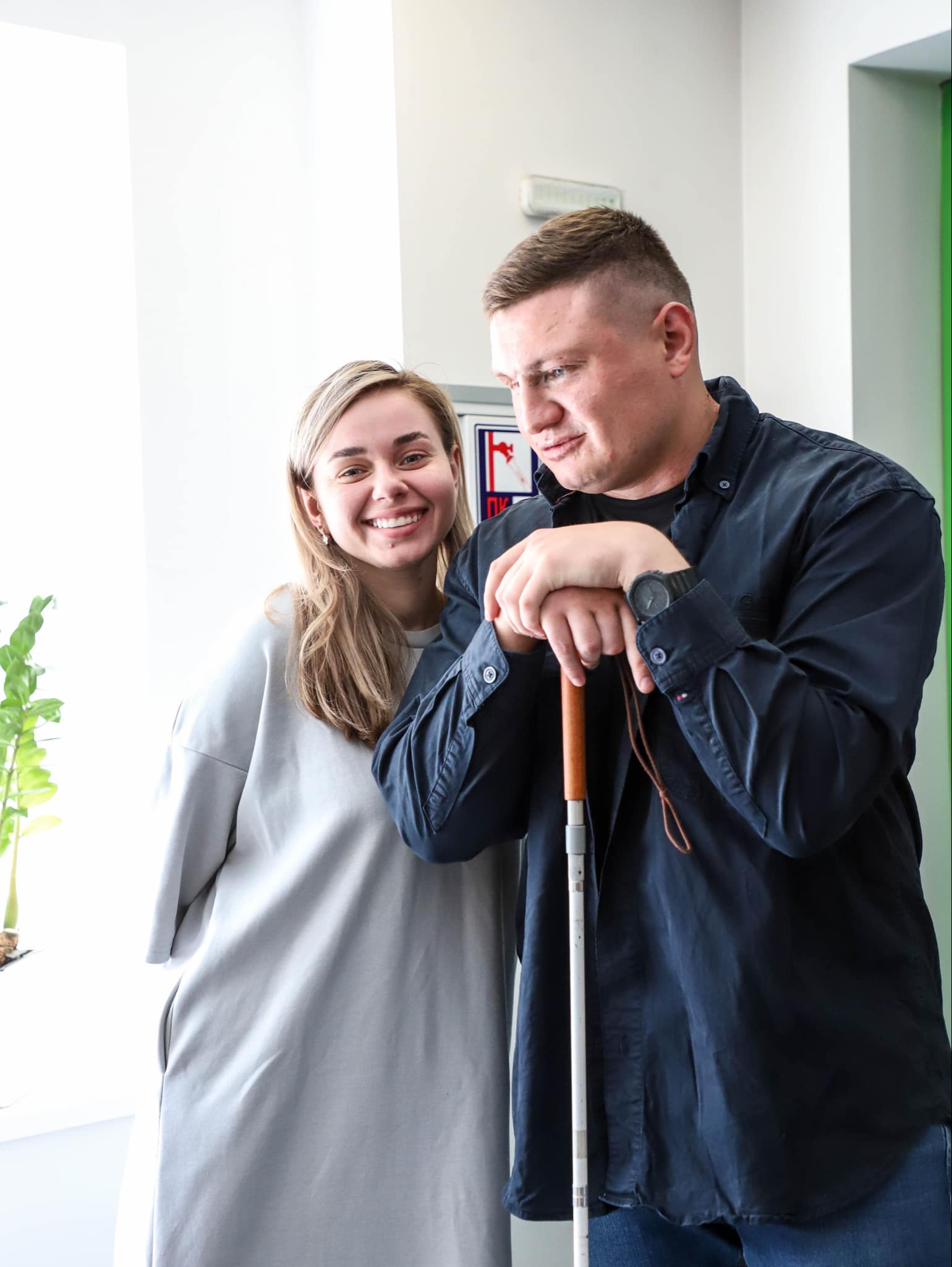 Н.С.: Ми беремо тільки в парі на реабілітацію. Для чого потрібно долучатися дружині, мамі, сестрі чи комусь з близьких? Бо правильної комунікації та взаємодії також треба навчити. Родина має знати, як правильно допомагати й пропонувати допомогу. І дружині (опікуну) потрібна допомога, бо вона теж травмована такою ситуацією. В неї повне нерозуміння того, що далі буде з їхнім життям. Якщо ми з вами закриваємо очі, то рефлекторно не зможемо витримати більше 10 секунд. А тут виключено світло назавжди. Звісно, нам не під силу повернути військовим втрачені очі, але ми можемо змінити якість їхнього життя. І робимо для них і їхніх родин все від нас залежне.