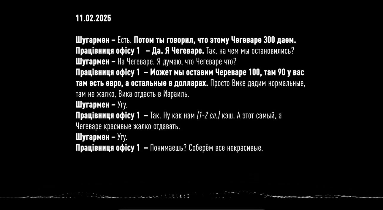 Зокрема, 10 лютого 2025 року під час розмови Цукерман надав вказівку Устименко підготувати 300 тисяч для віце-прем'єр-міністра України Чернишова. "11 лютого 2025 року під час розмови Устименко узгодила з Цукерманом розподіл грошей отриманих від особи з псевдонімом Тенісист. Від нього група отримала 250 тисяч доларів.