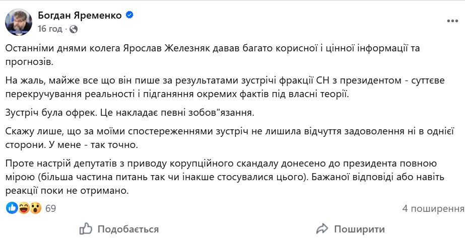 Як на ці питання реагував Президент? Богдан Яременко у себе в ФБ написав, що, за його спостереженнями, ця зустріч не лишила відчуття задоволення в жодної зі сторін".