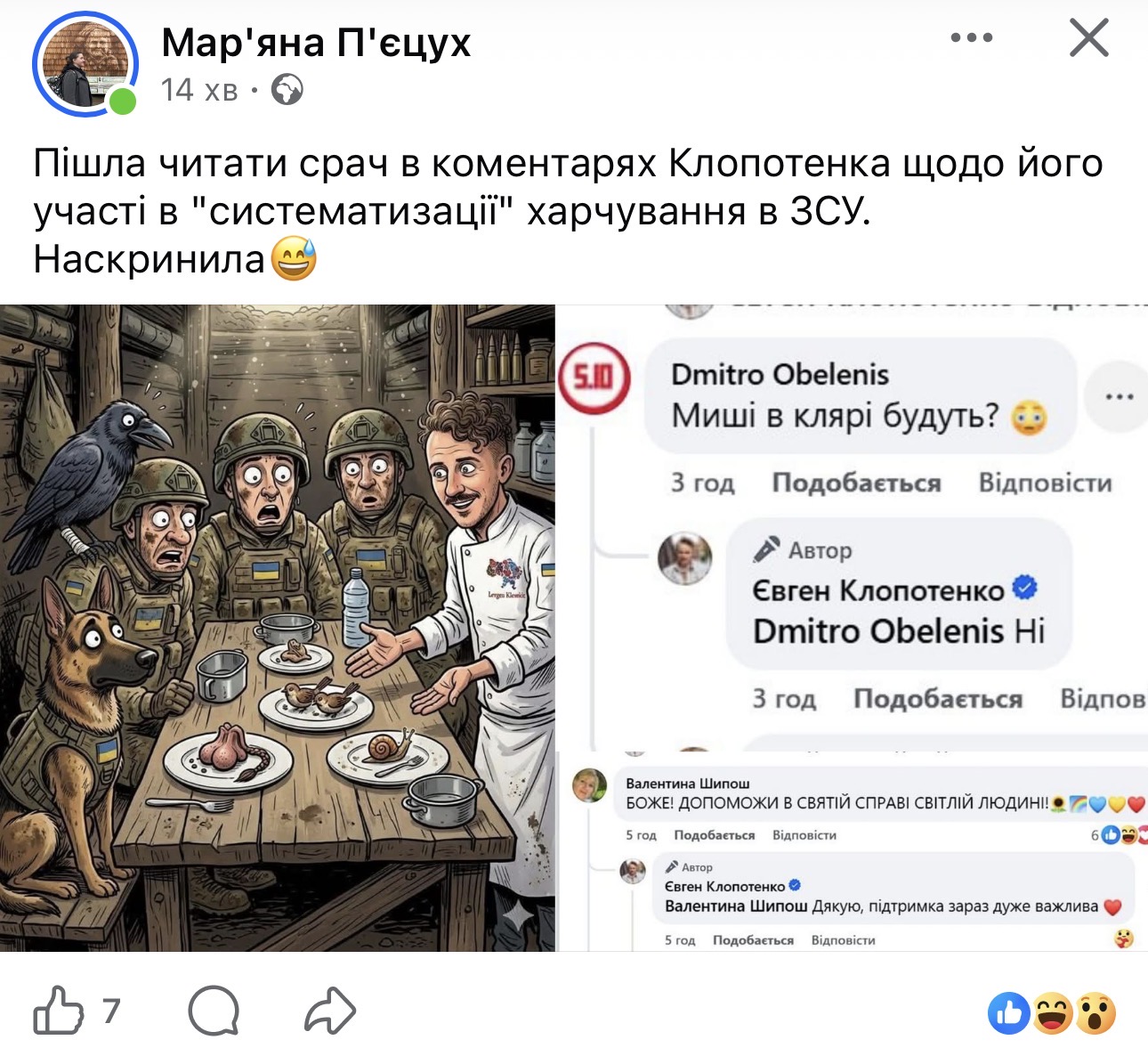 Вчора Агенція оборонних закупівель оголосила про запуск спільного з кулінаром Євгеном Клопотенком проєкту меню для військових частин. Того ж вечора, підозрюю, і АОЗ, і сам Клопотенко прочитали про себе багато цікавого. Від жартів про "банани з карі" до саркастичних питань на кшталт: "Чи будуть смажені миші в клярі?"