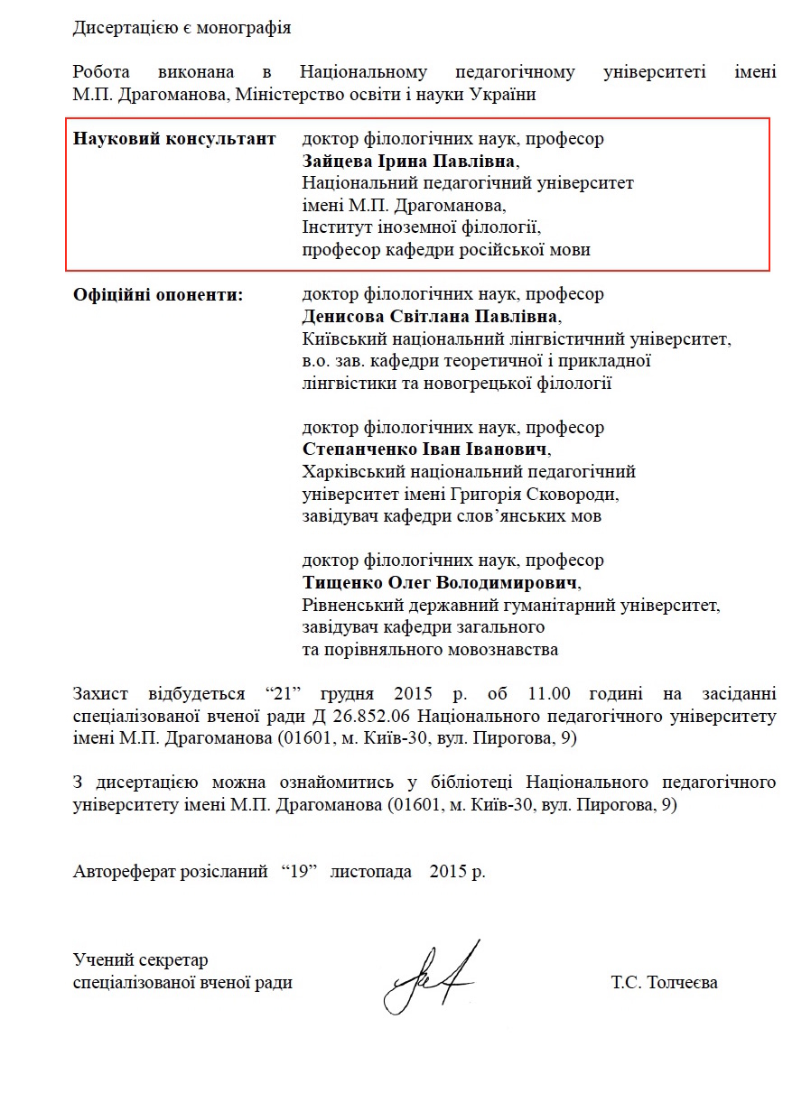 Ірина Зайцева - науковий консультант докторської дисертації Алли Зернецької.