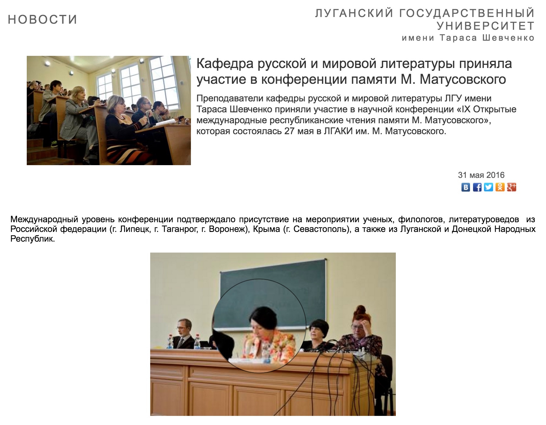Але не будемо відволікатися від головної героїні публікації, яку анітрохи не засмутила компанія шовіністів та інших світочів "русского мира". Той самий сайт повідомив, що 27 травня цього року Ірина Зайцева взяла учать ще в одному заході - конференції пам'яті М. Матусовського. Новина містить фотографію, на якій ви можете побачити Ірину Павлівну власною персоною.