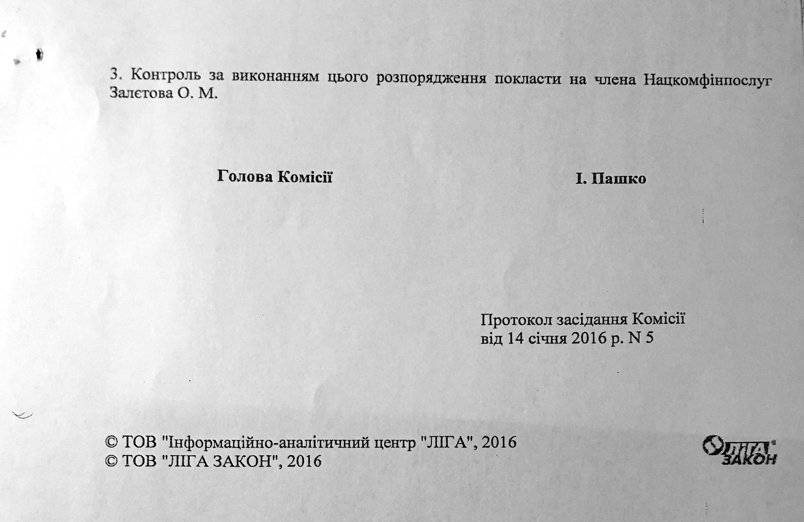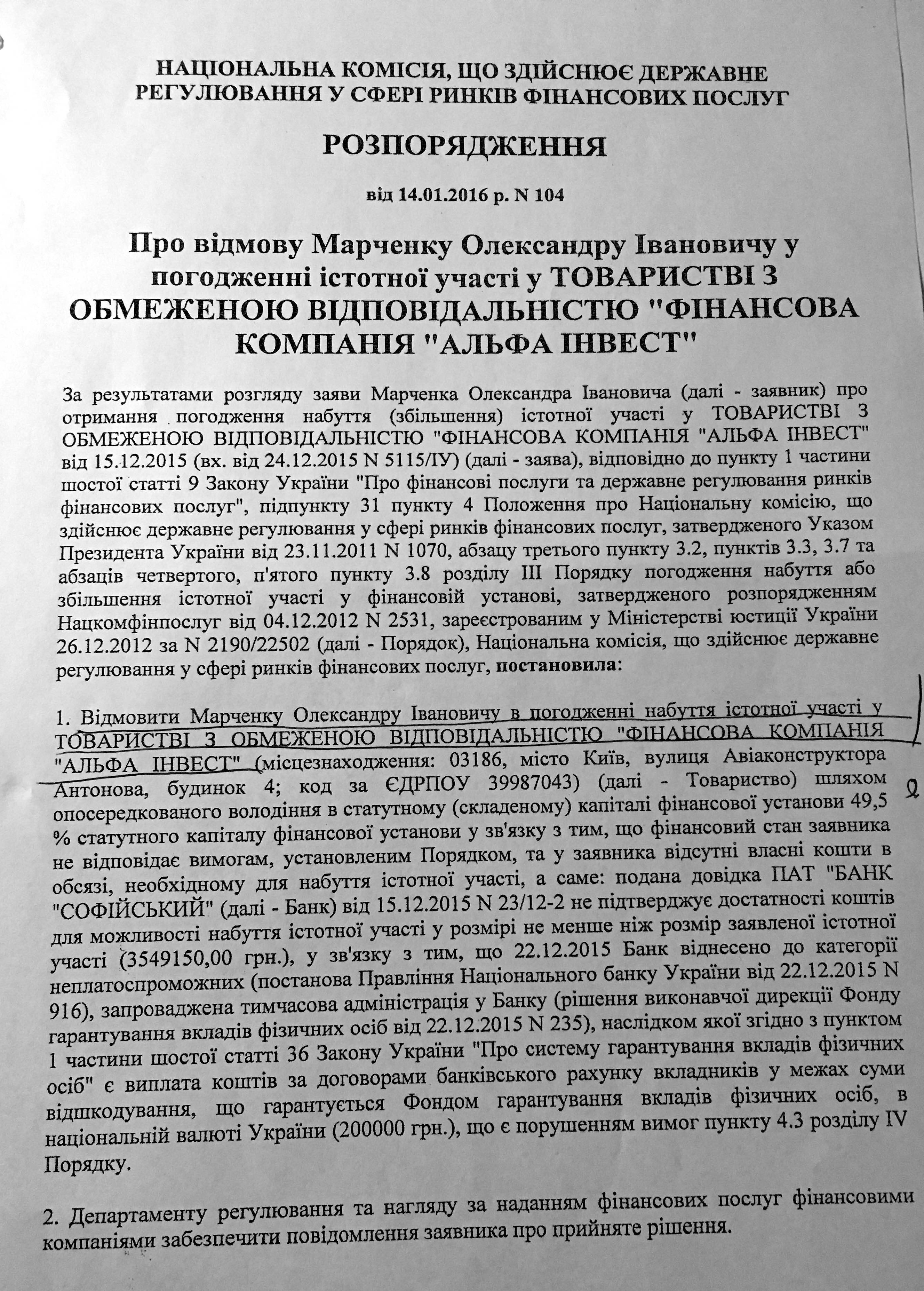 Проверить факт подлога очень просто. Например, еще 14 января 2016 года Национальная комиссия, которая осуществляет государственное регулирование в сфере рынков финансовых услуг, своим распоряжением №104 отказала А.Марченко в согласовании существенного участия в "Альфа Инвест".