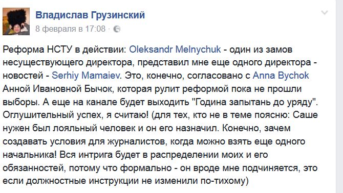 - Недавний пост в Фейсбуке руководителя службы новостей "Перший.ua" Влада Грузинского. Он пишет, что ему назначили зама. Назначили насильно, и теперь на канале будет выходить "Година запитань до уряду"