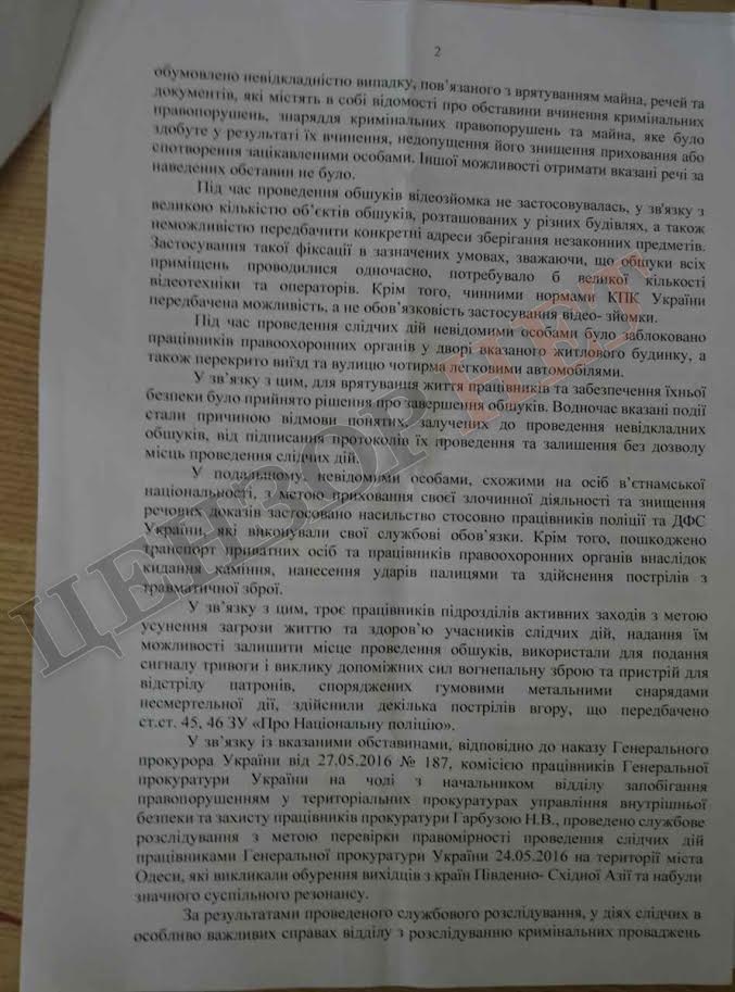 "Ми вже ним не займаємось. Ми займались ним десь місяць або півтора… Ми віддали провадження, щоб не було спекулювань… Було одразу зареєстровано кримінальне провадження по факту в Одесі начебто розбою і перевищення повноважень зі сторони слідчих. Було відео, що задокументували факти заволодіння побутовими предметами, технікою і т.ін., але наскільки мені відомо, на тих відео таких фактів немає", - додав Гуцуляк.
