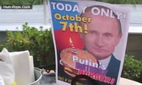 Очередное доказательство всемирной популярности Владимира Путина, ТАСС:"Нью-йоркский ресторан Lucy's Cantina Royale будет подавать 7 октября по случаю дня рождения президента России Владимира Путина особый "пятиэтажный" гамбургер. Гамбургер, в частности, готовится с использование м нескольких котлет из говядины высокого качества, острого майонеза, острого соуса шрирача, а также смеси кориандра и лука. Попробовать сэндвич можно только раз в году - в день рождения президента РФ. Бургер, названный в честь главы российского государства, примерно в шесть раз превосходит по размеру обычные сэндвичи и отличается сочностью, обычно его подают с острым картофелем фри... Один из менеджеров ресторана Тед Брайен сообщил ТАСС, что Путин - единственный государственный лидер, день рождения которого отмечают в заведении подачей особого блюда. Брайен констатировал, что Путин обладает значительным влиянием".