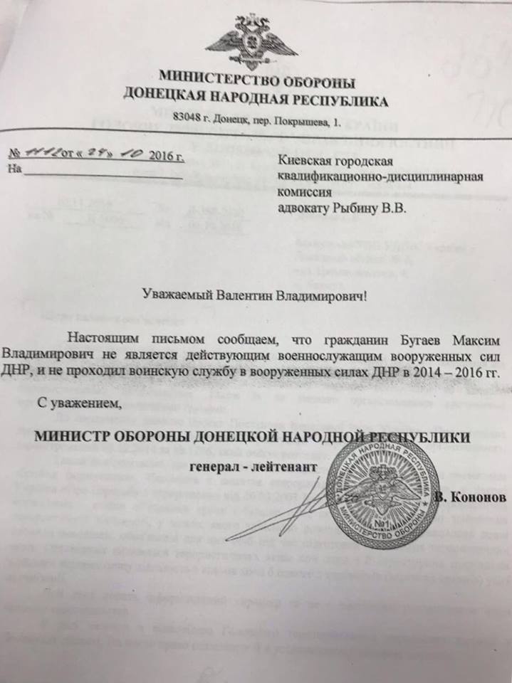 Кононов написал Рыбину личный ответ - мол, нет, нет, не беспокойтесь, Бугаев в "ДНР" не служил, все в порядке. И это письмо Рыбин приносит в качестве доказательства в украинский суд.