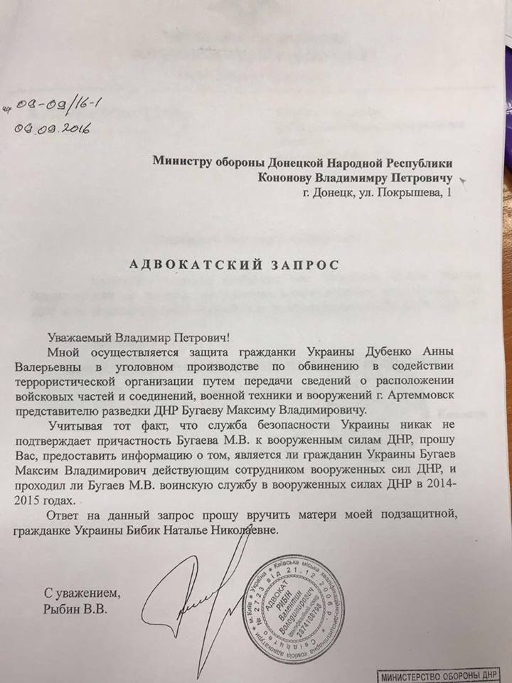 В суде по обвинению в шпионаже против бывшей военнослужащей 54-й бригады Анны Дубенко Валентин Рыбин совершил вызывающее преступление. Рыбин связался с российскими террористами, а именно, одним из главарей "ДНР" Кононовым. В адвокатском запросе он просил Кононова указать, была ли Дубченко на связи с офицером российских спецслужб Бугаевым.