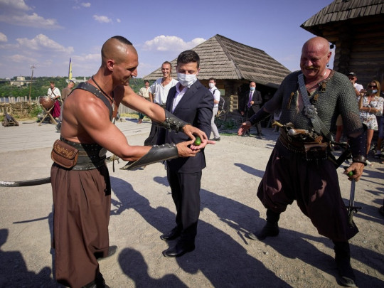 Володимир Зеленський був із робочим візитом у Запоріжжі 19-20 серпня. Під час відвідування Хортиці він взяв участь в одному з трюків. Йому на долоню поклали невеликий огірок, і під звуки барабанів той самий артист Лозовий за допомогою гострої шаблі ефектно розрізав овоч, не пошкодивши при цьому руку.