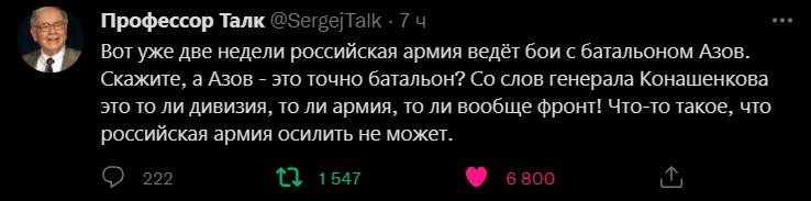 "Триває оборона Маріуполя - південного форпосту України.Бійці окремого загону спеціального призначення НГУ Азов точними ударами нанесли вогневого ураження бронетехніці РФ, знищивши тим самим живу силу окупантів, а також лишивши ворога можливості обстрілювати місто і просуватися на підступи з одного із напрямків. Усі військовослужбовці, які мужньо обороняють місто, роблять усе можливе аби ворог не зміг просунутись далі. Крім того і військовослужбовці і правоохоронці намагаються постійно надавати допомогу громадянам які страждають від численних обстрілів та авіаударів", - йдеться у повідомленні.