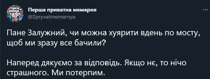 "Щодо Антонівського мосту в Херсоні та інших переправ в області. Звичайно, всі вони будуть відбудовані, але вже нами. Робимо все для того, щоб в окупантів не залишалося жодних логістичних можливостей на нашій землі.
