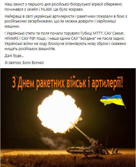 Дякую воїнам ракетних військ і артилерії за службу! Ви бережете кров піхоти! Зупиняєте ворожий наступ і створюєте умови для просування наших військ уперед. Самовіддано наближаєте нашу Перемогу. Вітаю із професійним святом і бажаю всім вам повернутися до своїх рідних живими й неушкодженими!