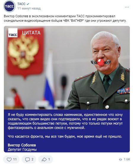 Російський генерал і депутат-комуніст Держдуми РФ Віктор Соболєв назвав найманців ПВК "Вагнер" схильними до гомосексуальних стосунків.