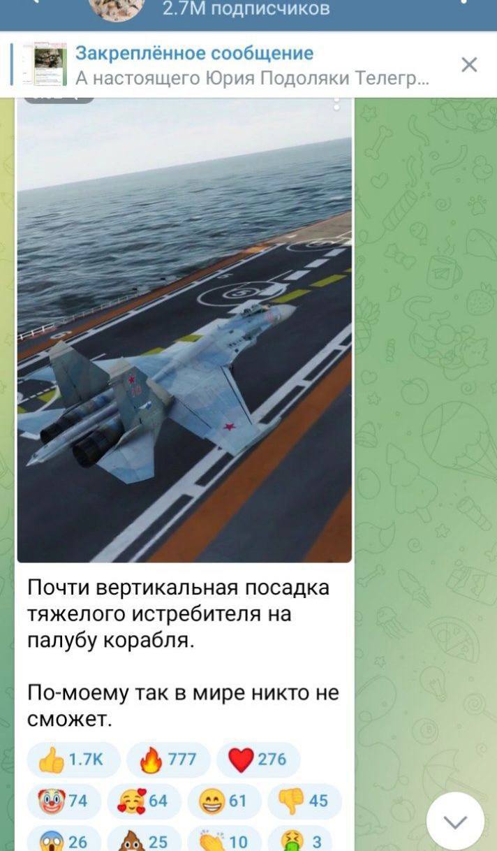 Але для російських льотчиків це перешкода. Ну і що, від такої посадки шматки цього літака повинні бризнути по обидва боки палуби. Вони можуть! Наприклад, якщо заявлена швидкість ракети "Авангард" по ТТХ перевищує 20 мах при якій будь-який метал просто плавитися, а вона "літає", то і літак вагою 17 тонн теж може вертикально падати на палубу і залишатися цілим.