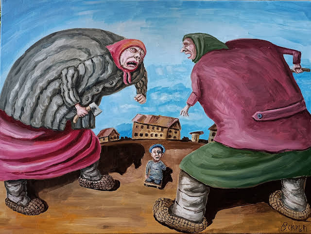 "На картине запечатлен момент битвы самок скрепозавра за единственного самца. В связи со стремительным отрицательным развитием pоссии, в ней случился острый дефицит особей мужского пола, большинство скрепозавров вымерли от излишнего потребления технического спирта, часть же отдали свои никчемные жизни, сражаясь за величие pоссии. Каждая особь мужского пола является ценной единицей и самки яростно сражаются за них. На картине изображён не просто самец скрепозавра, это ветеран спецоперации, герой ветеран пенсионер и соответственно - завидный жених, мечта любой скрепозаврихи, поэтому битва будет кровопролитной." (Семён Скрепецкий.)