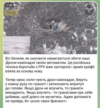 Я ж кажу - вони тренуються самовбиватись. Нормальна людина б з калаша намагалась поцілити, вискочила б ями, щось підпалила б, аби важче було б її поцілити з дрона. Бо в нормальної людини - є надія. Завжди. Навіть коли без всіх кінцівок лежить і дивиться в небо - остання думка "а може зараз супермен прилетить і спасе".