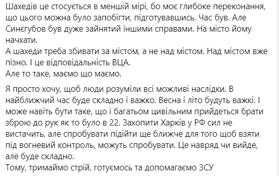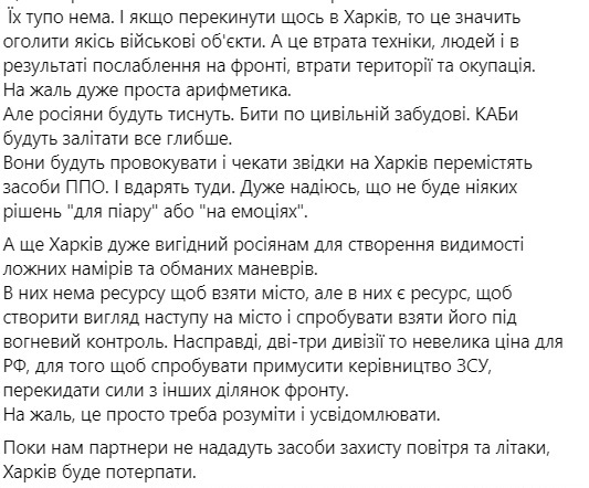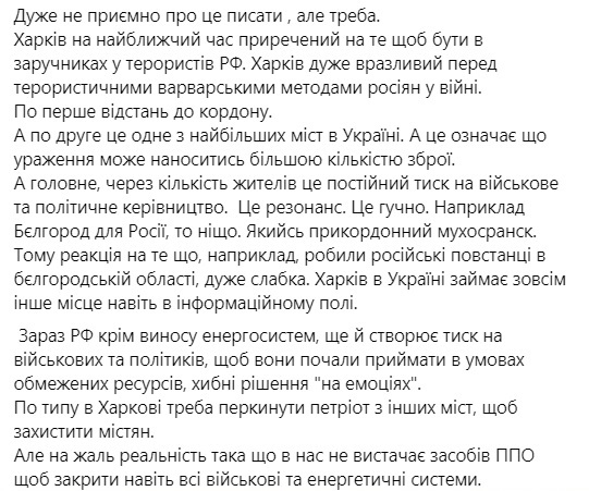 1. Дуже не приємно про це писати , але треба. Харків на найближчий час приречений на те щоб бути в заручниках у терористів РФ. Харків дуже вразливий перед терористичними варварськими методами росіян у війні.