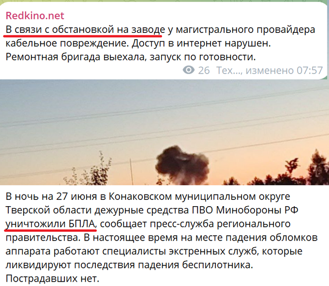 За інформацією місцевих мешканців, у Тверській області дрони атакували Редкінський дослідний завод, який є одним з найбільших хімічних виробництв регіону.