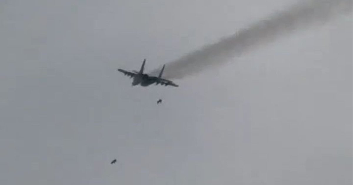 Український МіГ-29 скидає дві високоточні авіабомби AASM-250 "Hammer" на позиції росіян. ВIДЕО
