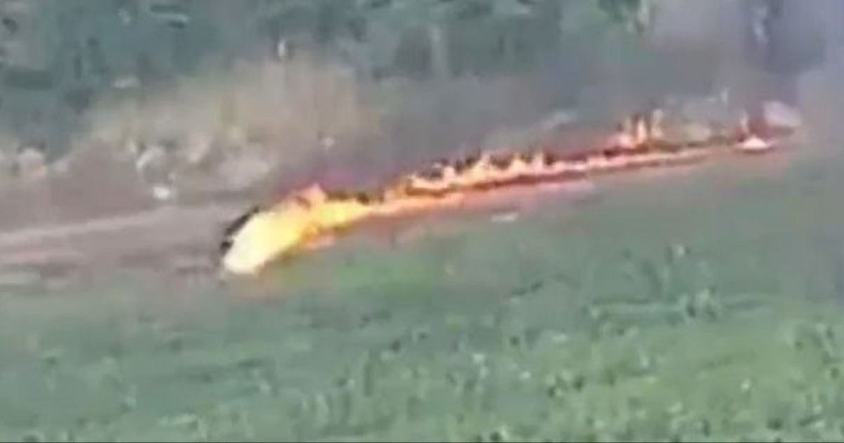 Уражений дроном окупант-мотоштурмовик мчить на палаючому мотоциклі, залишаючи вогняний слід. ВIДЕО