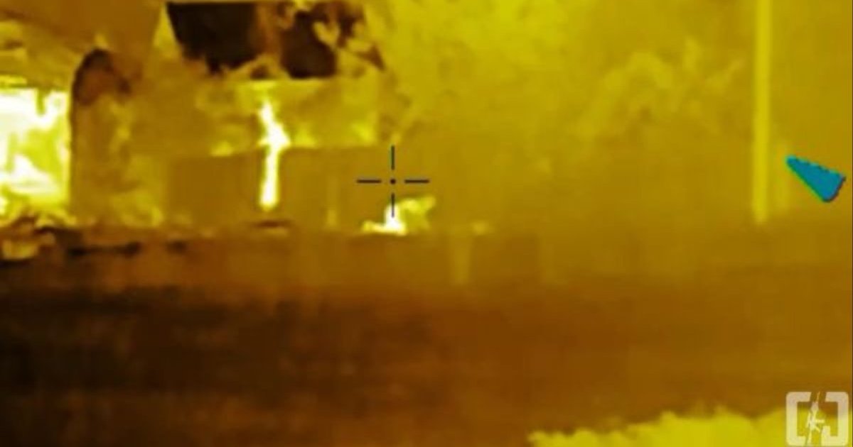 На кадрах видно, як після удару по будинку, де ховалися військові РФ, один окупант виповзає з палаючого будинку. Загарбник тієї ж миті був ліквідований прицільним пострілом українського снайпера.