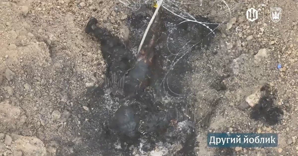На оприлюднених кадрах видно, що після чотирьох скидів з українських дронів від одного загарбника залишився лише обпалений череп, іншому - відірвало ноги.