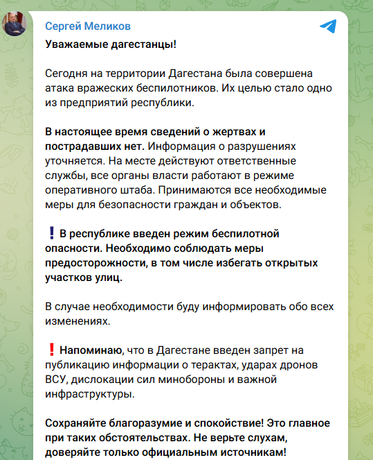 "Сьогодні на території Дагестану було здійснено атаку ворожих безпілотників. Їхньою метою стало одне з підприємств республіки. Наразі відомостей про жертв та постраждалих немає. Інформація про руйнування уточнюється".