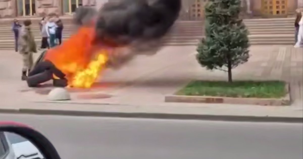 Чоловік підпалив автомобільні шини біля будівлі КМДА на вулиці Хрещатик у Києві.