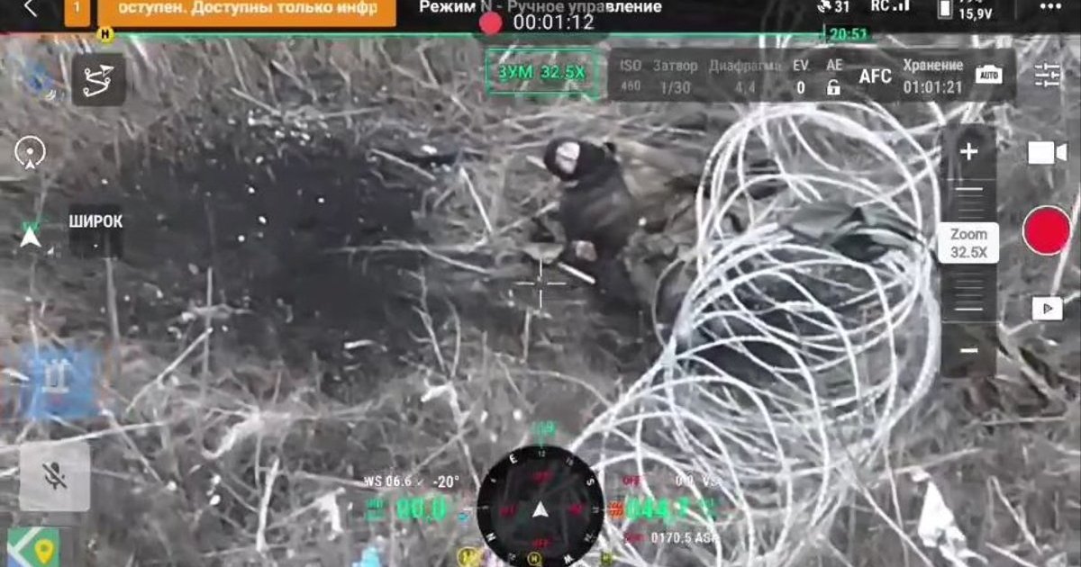 Австралійський доброволець ЗСУ опублікував відео, на якому його побратими ліквідовують ударним дроном рашиста, який лежить під лінією натягнутого колючого дроту.
