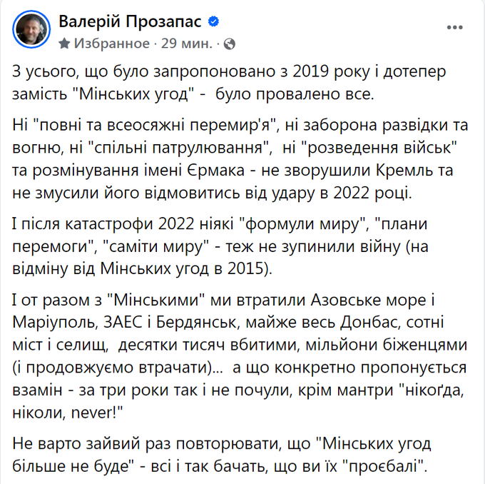 Все, що зараз доноситься з тих "перемовин", і близько не нагадує "злочинні Мінські", згідно яких припинявся вогонь, після виводу незаконних формувань з території України та ПОВНОГО відновлення контролю над кордоном вирішувався статус ОРДЛО, а заручники обмінювались "всіх на всіх".