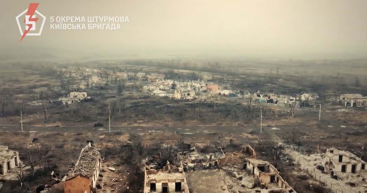 Оператори дронів 5-ї окремої штурмової Київської бригади показали кадри одного із зруйнованих сіл Донеччини.