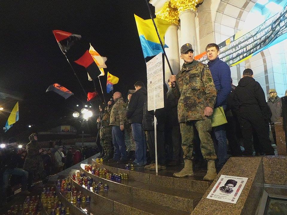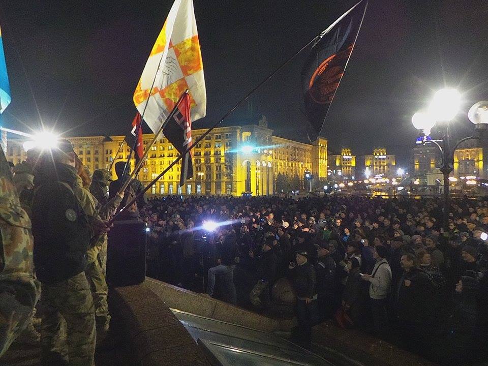 Підтримавши блокаду окупованих територій Донбасу і виступивши проти репресій щодо учасників добровольчого руху, організатори акції закликали присутніх пройти до офісу компанії Ріната Ахметова СКМ на Михайлівській площі.
